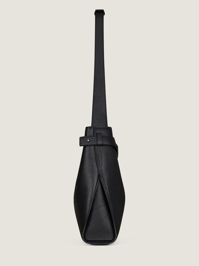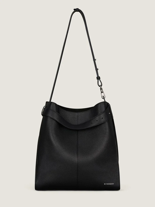 Medium Hobo Crossbody Bag in Grained Calfskin Leather. Belted Line. Front Adjustable Leather Belt to Cinch the Bag’s Opening for