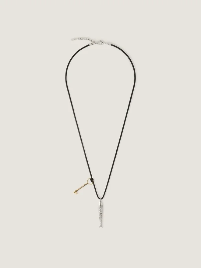 Necklace in Leather Cord with Metal Charms. Lucky Charms Line. Unfixed Charms Inspired from Hubert De Givenchy’s Objects: Golden-Finish Metal Key and
