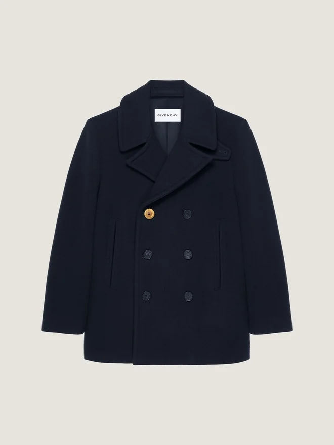 Peacoat in Wool. Notch Lapel and Small Flap. Gros Grain Detail on the Neckline, on the Inside. Double Breasted. Givenchy Engraved