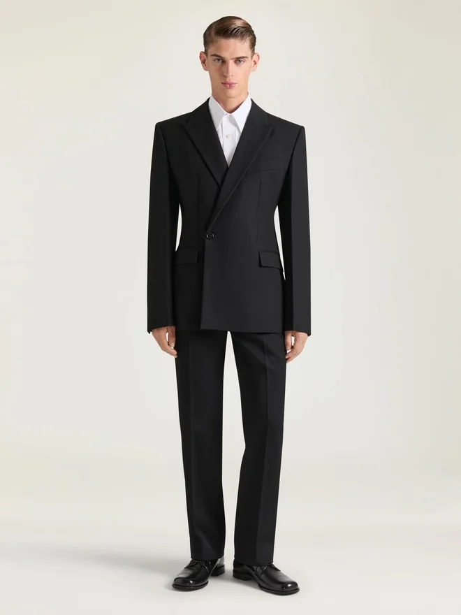 Structured Jacket in Wool Grain De Poudre. Asymmetric Peaked Lapel. Single Breasted. Buttoned Cuffs. One Chest Pocket. Two Front