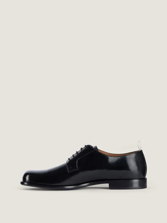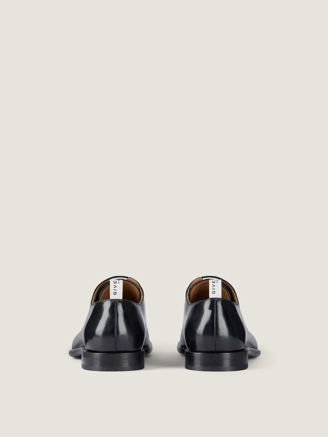 Derby Shoes in Brushed Bull Leather. Tux Line. Gros Grain Effect Leather Loop with Givenchy Paris Signature. Golden Givenchy