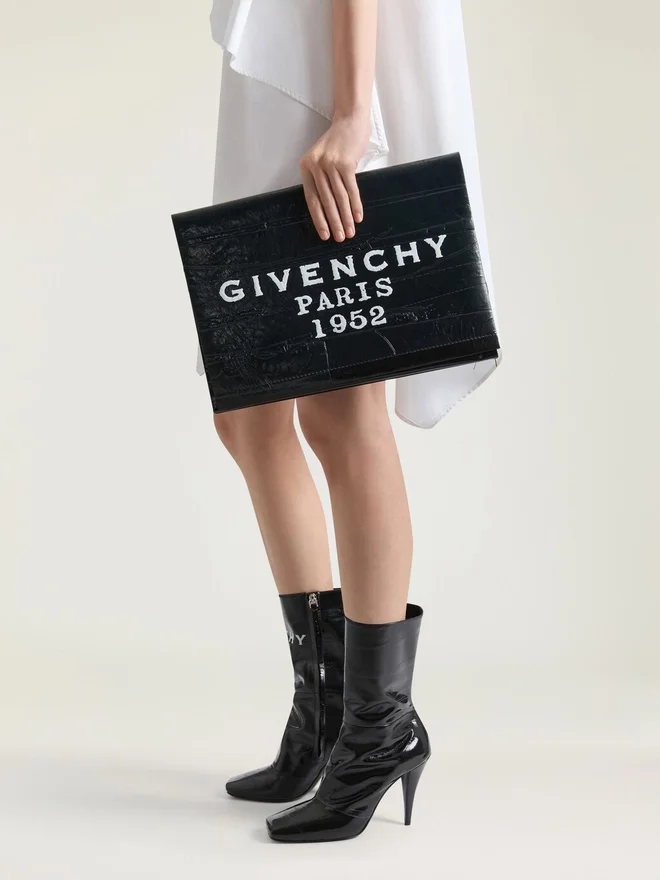 Pochette in Textured Leather. Flap Opening. Triple Gussets Construction. Givenchy Paris 1952 3D Print on the Front. Givenchy