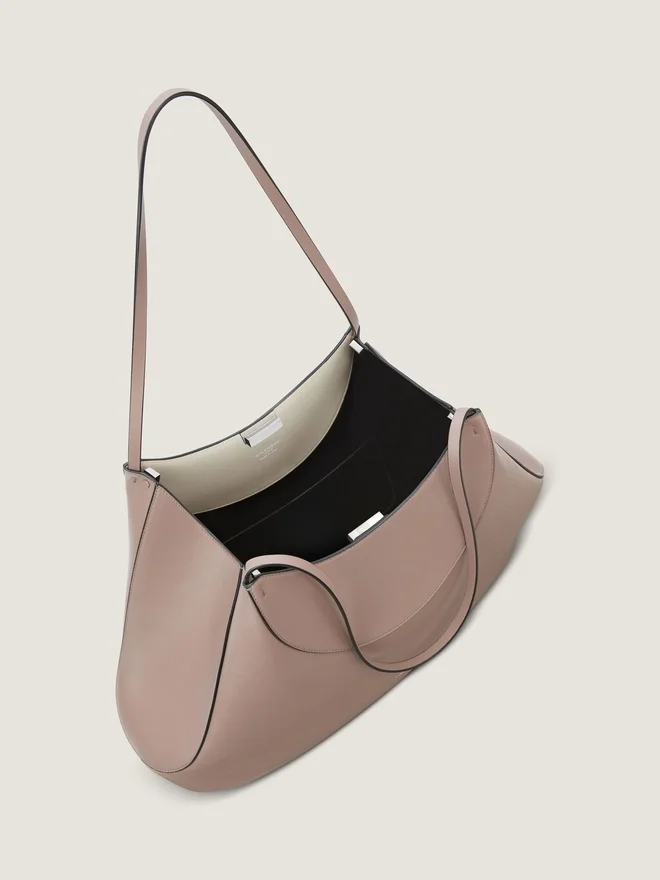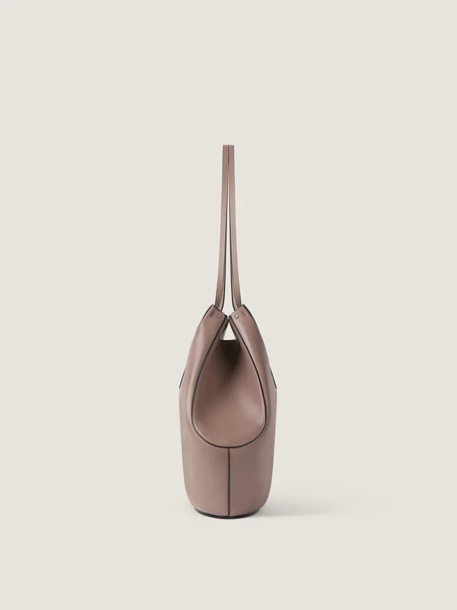 Medium Tote Bag in Soft Grained Calfskin Leather. Facet Line. Geometric Shape. Magnetic Closure. Leather Handles for Shoulder