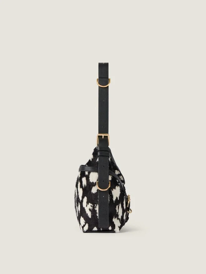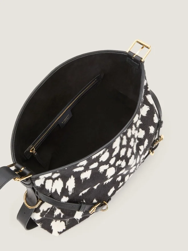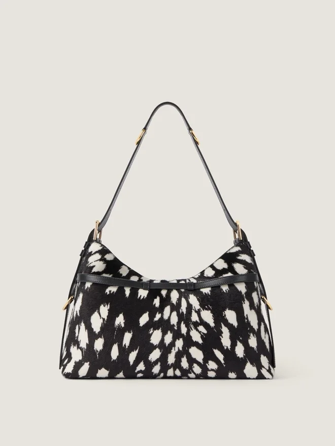 Medium Shoulder Bag in Pony Effect Calfskin Leather with Snow Leopard Pattern. Voyou Line. V-Shaped Slouchy Silhouette and