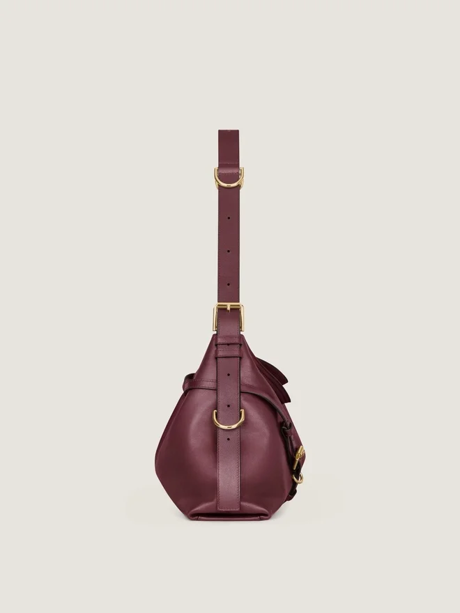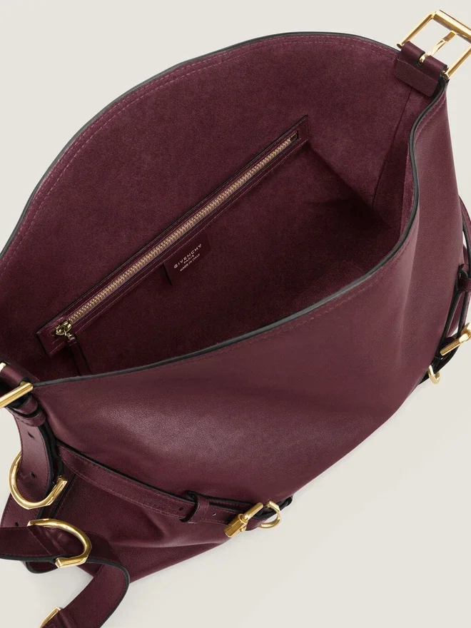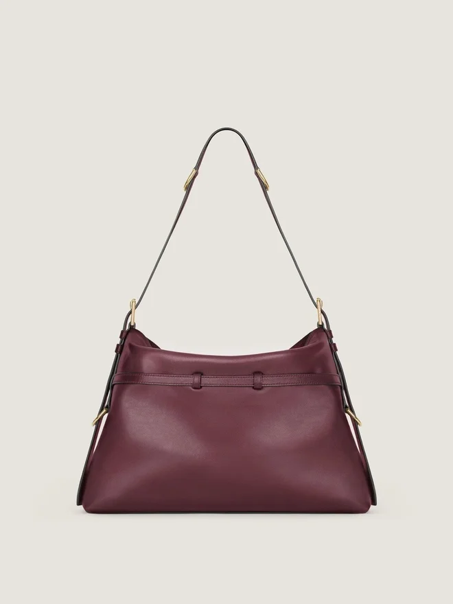 Medium Shoulder Bag in Elevated Smooth and Shiny Calfskin Leather. Voyou Line. V-Shaped Slouchy Silhouette and Generous Volume.