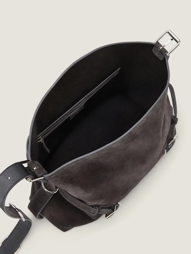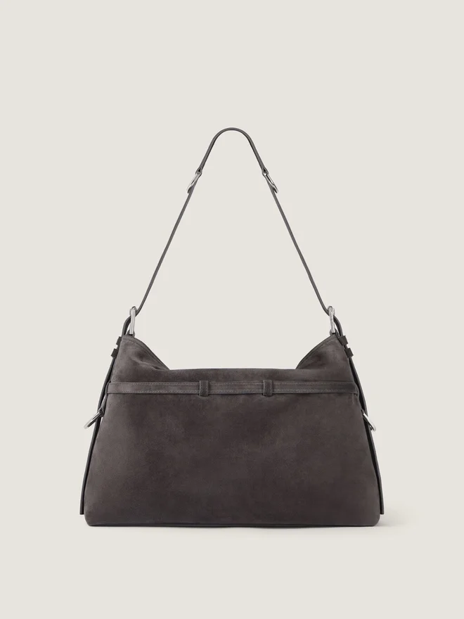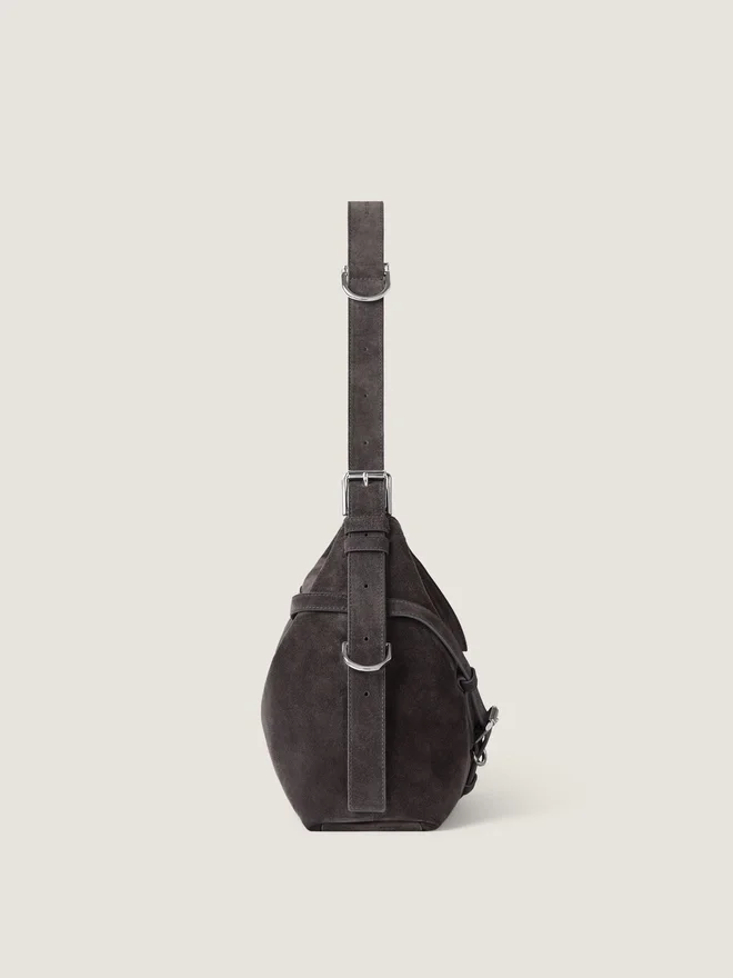 Medium Shoulder Bag in Suede Calfskin Leather. Voyou Line. V-Shaped Slouchy Silhouette and Generous Volume. Adjustable Shoulder