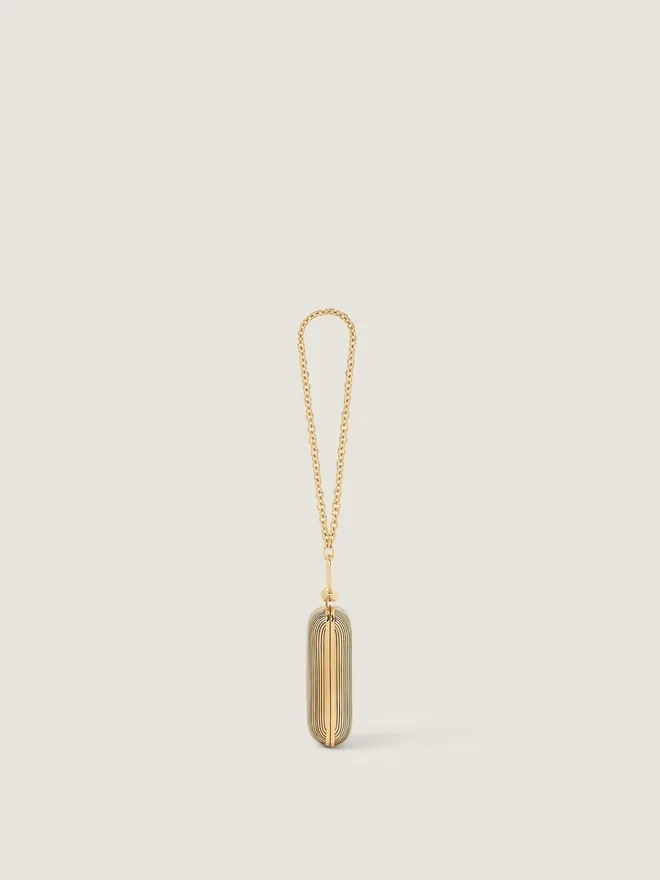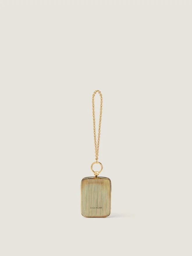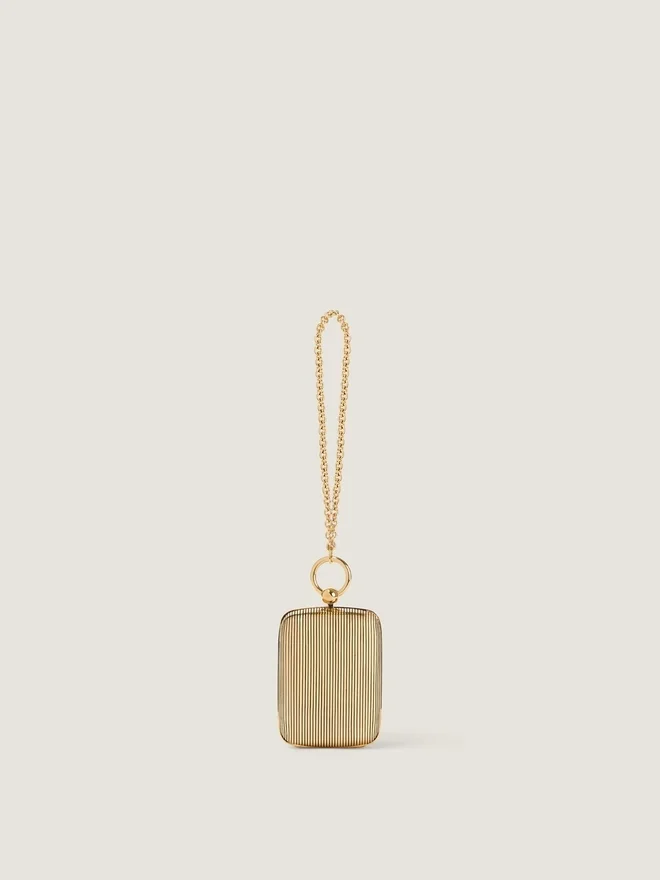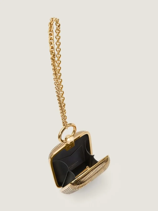 Micro Evening Clutch in Golden-Finish Metal. Functional Metal Hinge. Chain Strap with Metal Ring. Givenchy Signature Engraved on