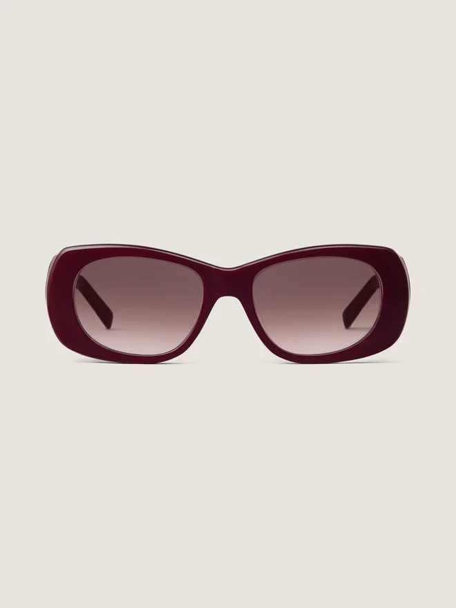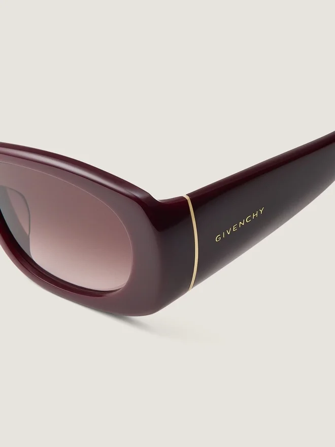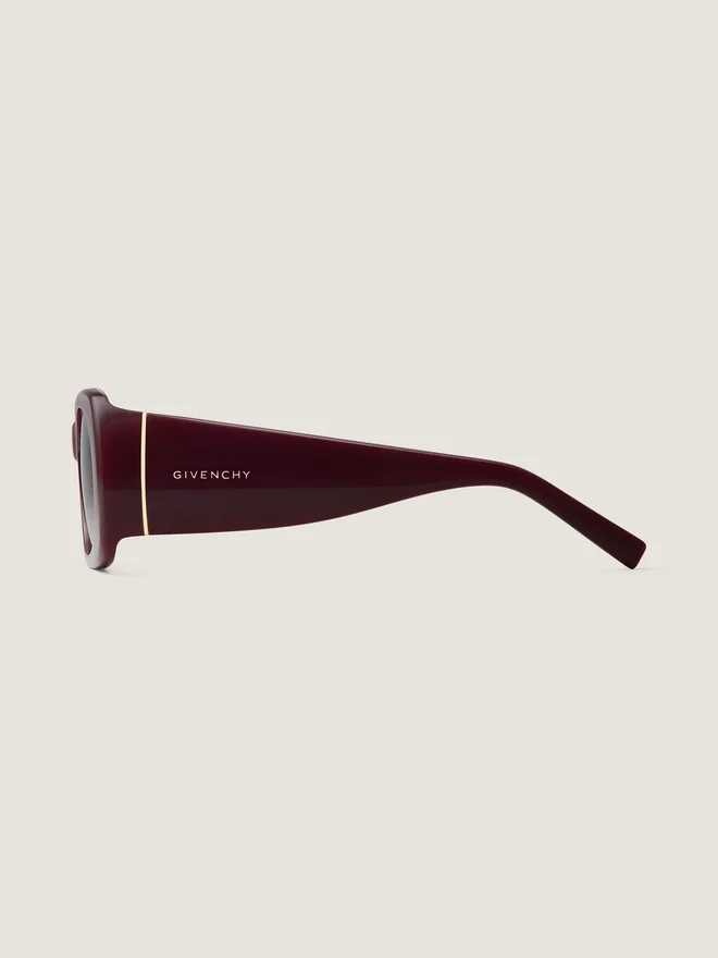 Sunglasses in Acetate. Givenchy Bold Line. Oval Rectangular Shape with Large Temples. Dark Bordeaux Color Lenses. Golden Givenchy