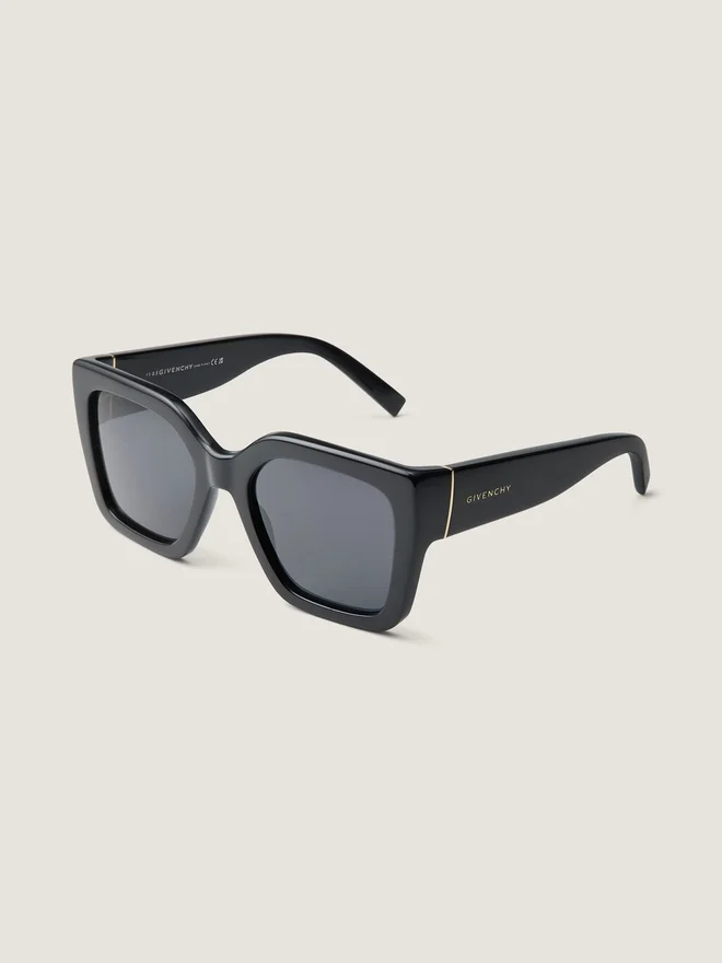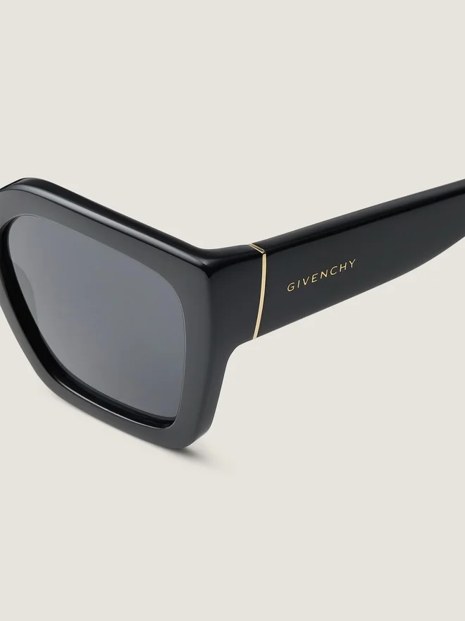 Sunglasses in Acetate. Givenchy Bold Line. Large Square Shape. Smoke Lenses. Golden Givenchy Signature Engraved on the Temples.