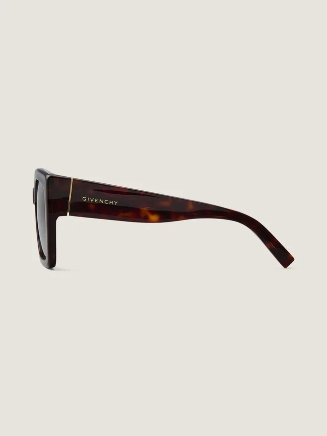 Sunglasses in Acetate. Givenchy Bold Line. Large Square Shape. Brown Lenses. Golden Givenchy Signature Engraved on the Temples.