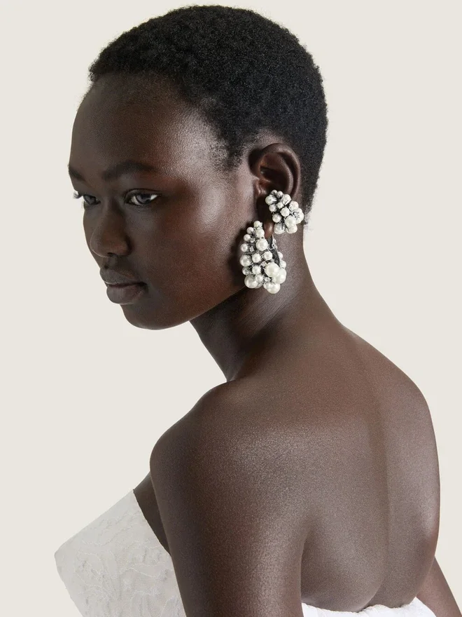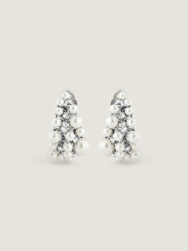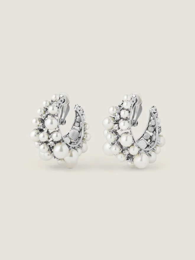 • Clip Earrings in Silvery-Finish Metal with Hand-Set Crystals and Pearls.