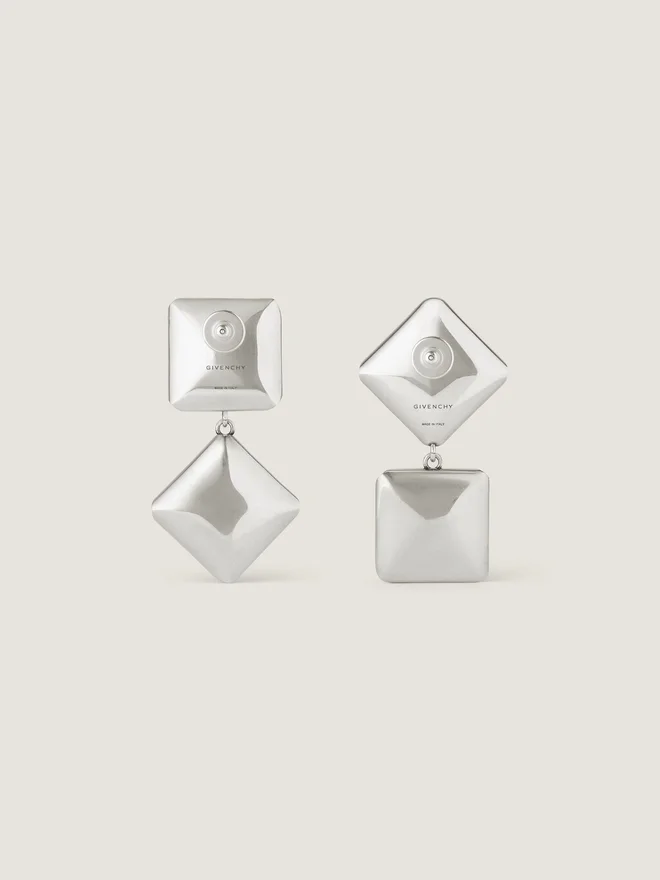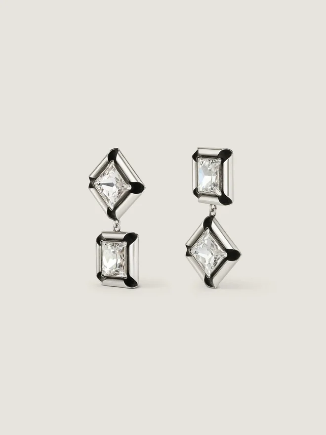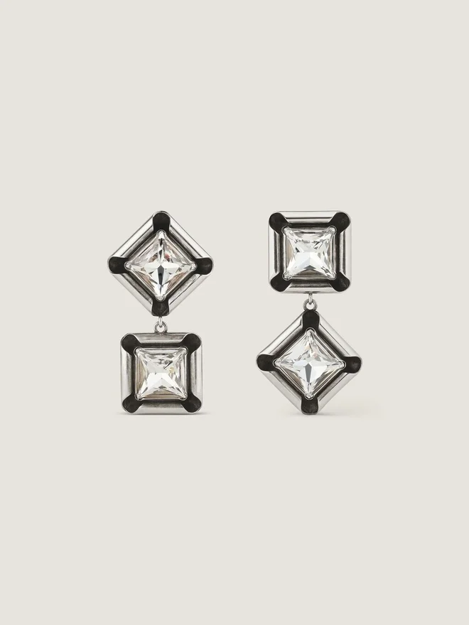 - Pendant Earrings in Silvery-Finish Oxidized Metal with Large Square and Diamond-Shaped Crystals.