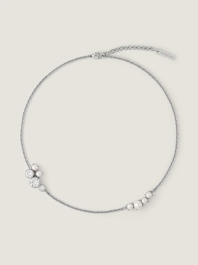 Short Necklace in Silvery-Finish Metal with Crystals and Pearls. Crystal Pearl Line. Adjustment Chain with Givenchy Engraved