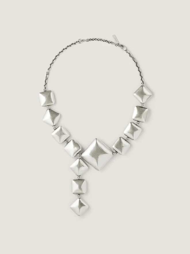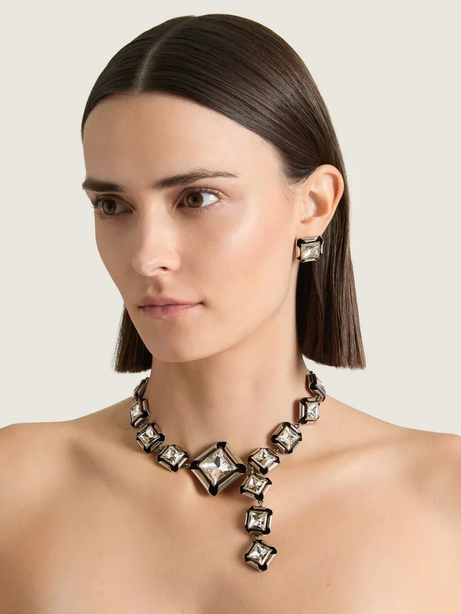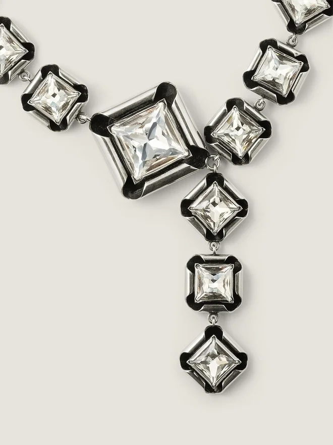 - Necklace in Silvery-Finish Oxidized Metal with Diamond-Shaped and Square Crystals in Varying Sizes, for a Deconstructed Look.