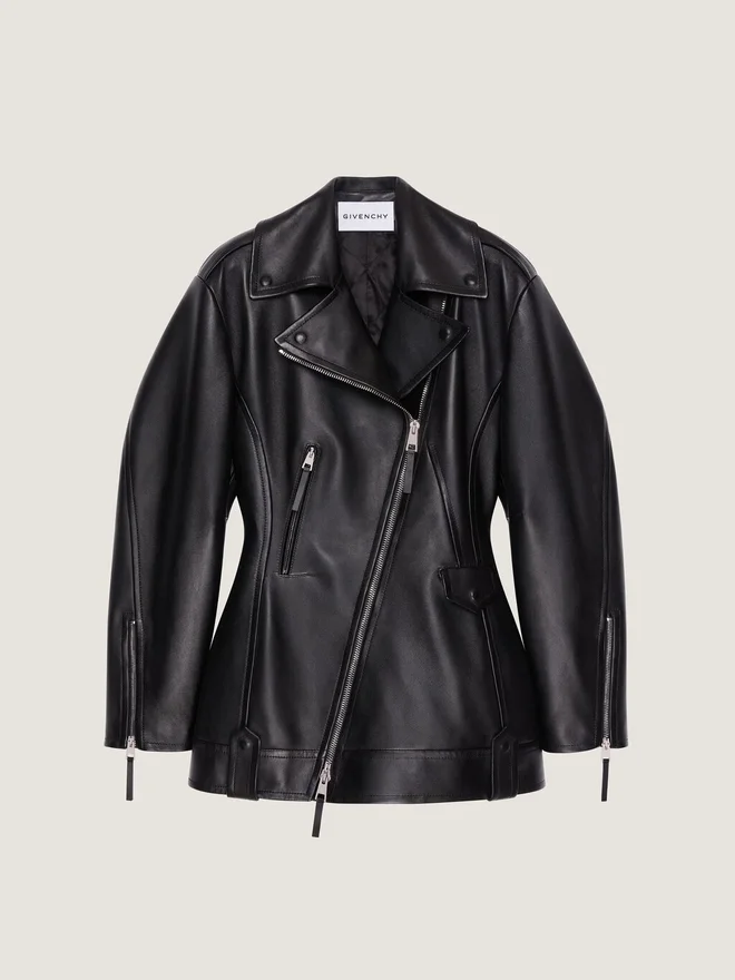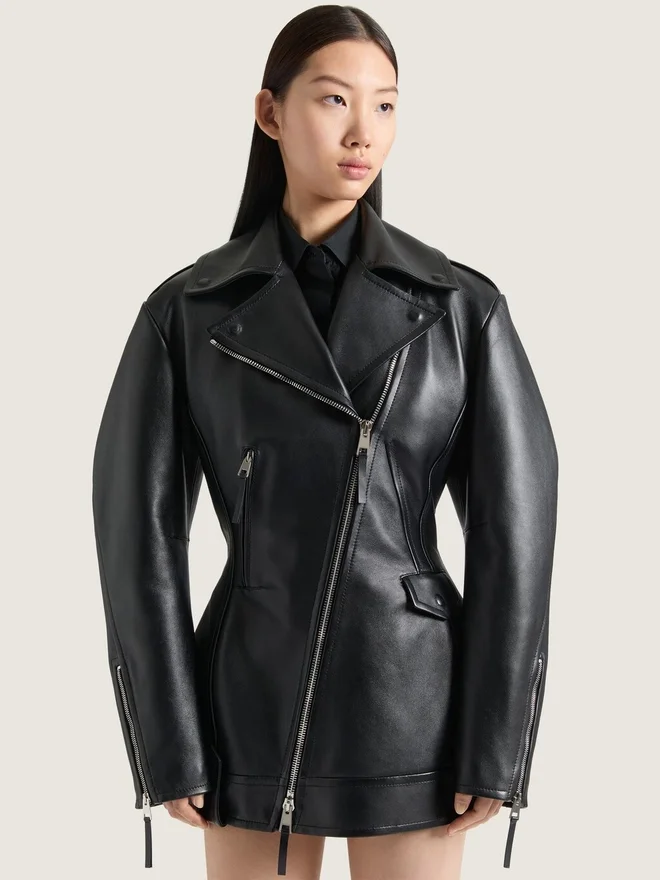 Hourglass Jacket in Leather. Zipped Closure on Bias. One Zipped Pocket on the Right Side and One Flap Pocket on the Left Side.