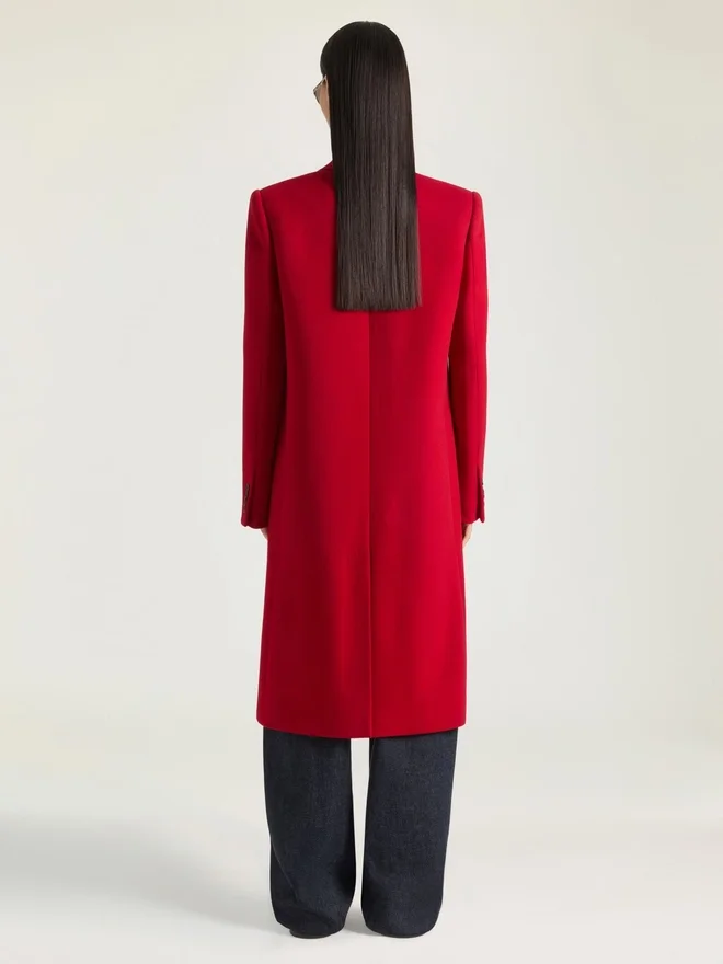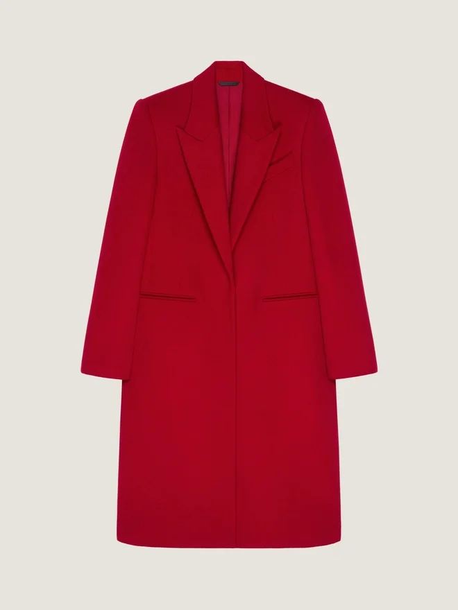 Coat in Wool. Peaked Lapel. Single Breasted. Buttoned Cuffs. One Chest Pocket. Two Front Pockets. Satin Lining. Model Measures