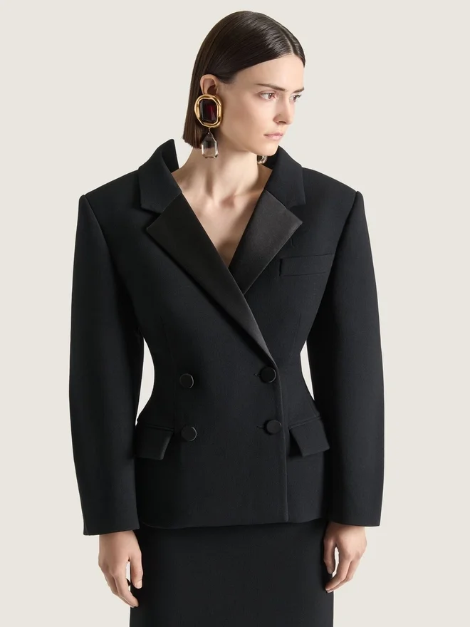 A Straight Silhouette with a Regular Fit and a Clean Waistline, Balancing Structure and Modernity. Tuxedo Jacket in Wool Crepe.