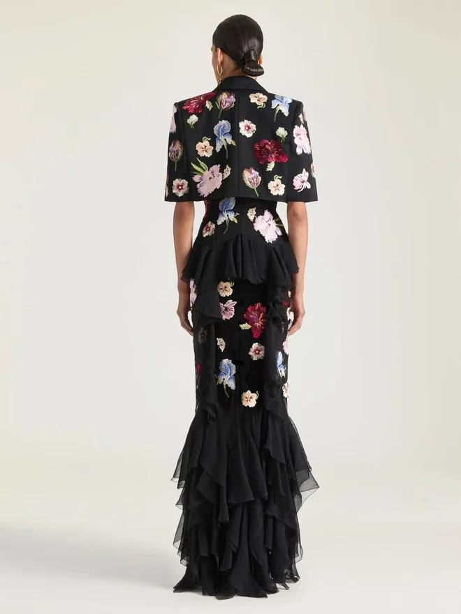 • Short-Sleeved Jacket in Grain De Poudre Wool with Floral Embroideries.
