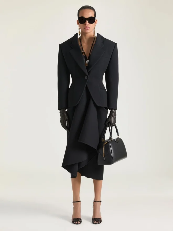 Short Structured Jacket in Wool Crepe. Notch Lapel. Slashed in the Back. Single Breasted. One Chest Pocket. Two Front Pockets.