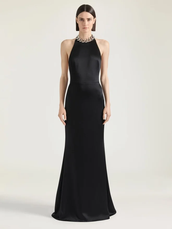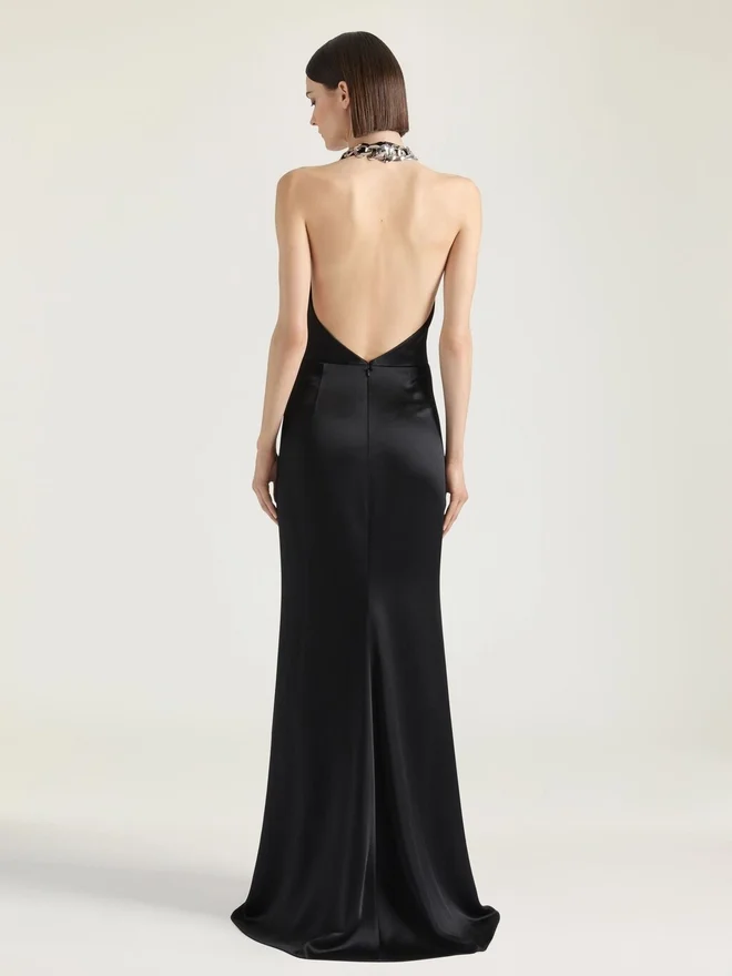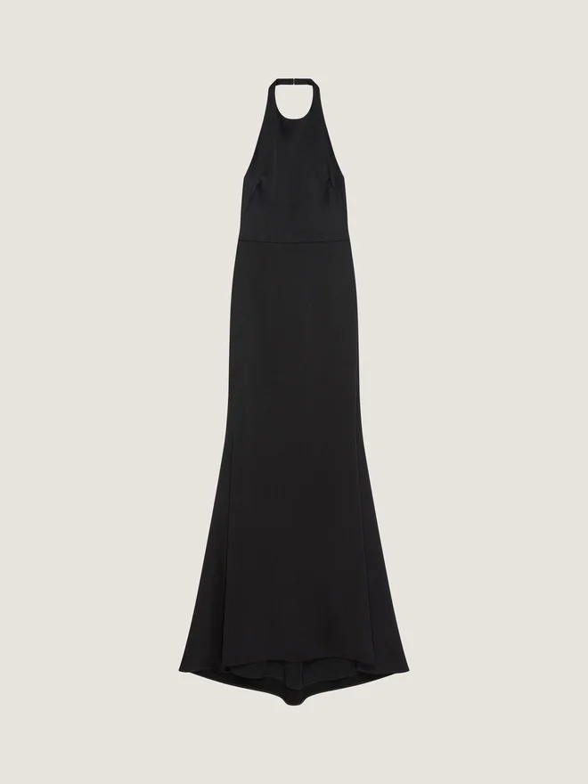 Long Dress in Crepe with Satin Back. Halter Neck. Open Back. Invisible Zipped Closure on the Back and Hook at Neck. Model