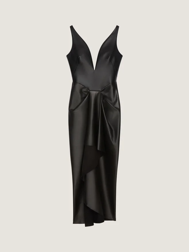 A Silhouette Inspired by the Gesture of Draping a Leather Jacket over a Mannequin. Fabrics Are Twisted and Wrapped Around the Body with Sensuality, While Front Slits and Pockets Create Movement and Attitude.