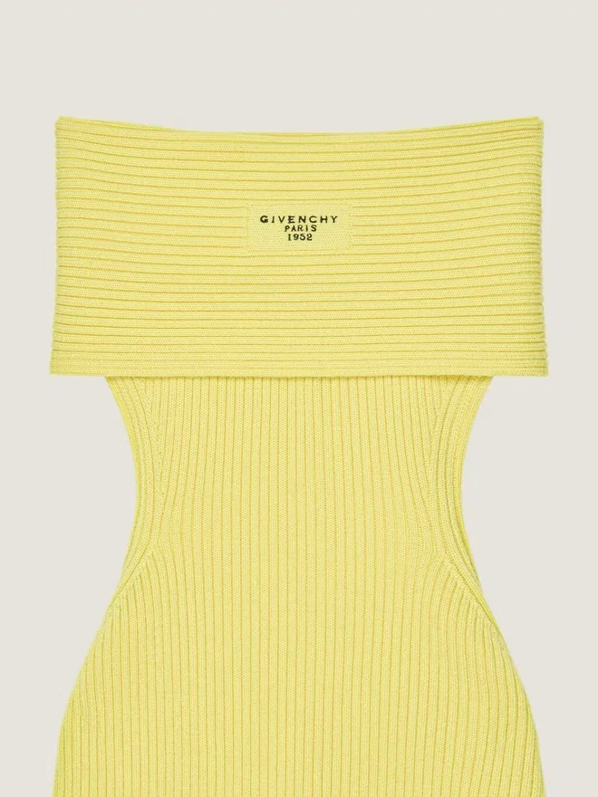 Off the Shoulder Mini Dress in Wool. Patch in Self-Fabric with Embroidered Givenchy Paris 1952 Signature on the Upper Back. Model