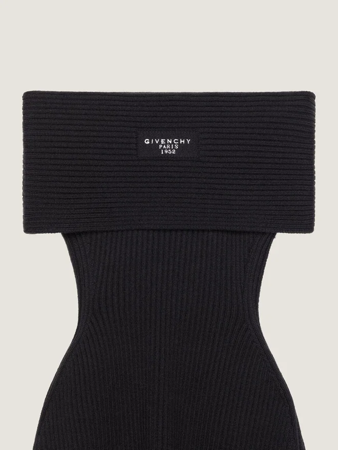 Off the Shoulder Mini Dress in Wool. Patch in Self-Fabric with Embroidered Givenchy Paris 1952 Signature on the Upper Back. Model