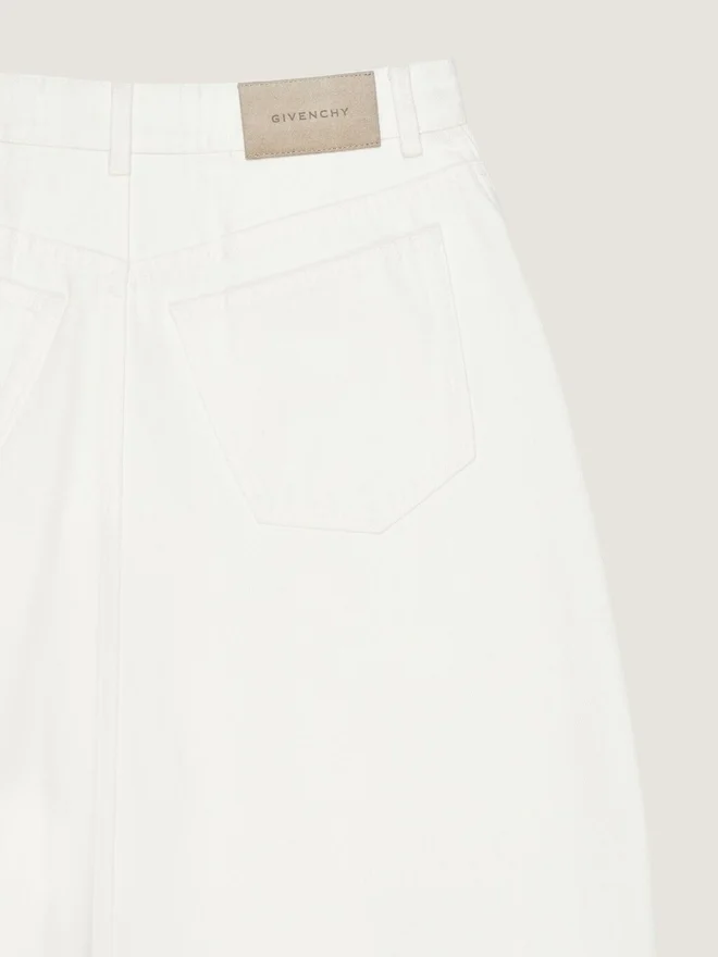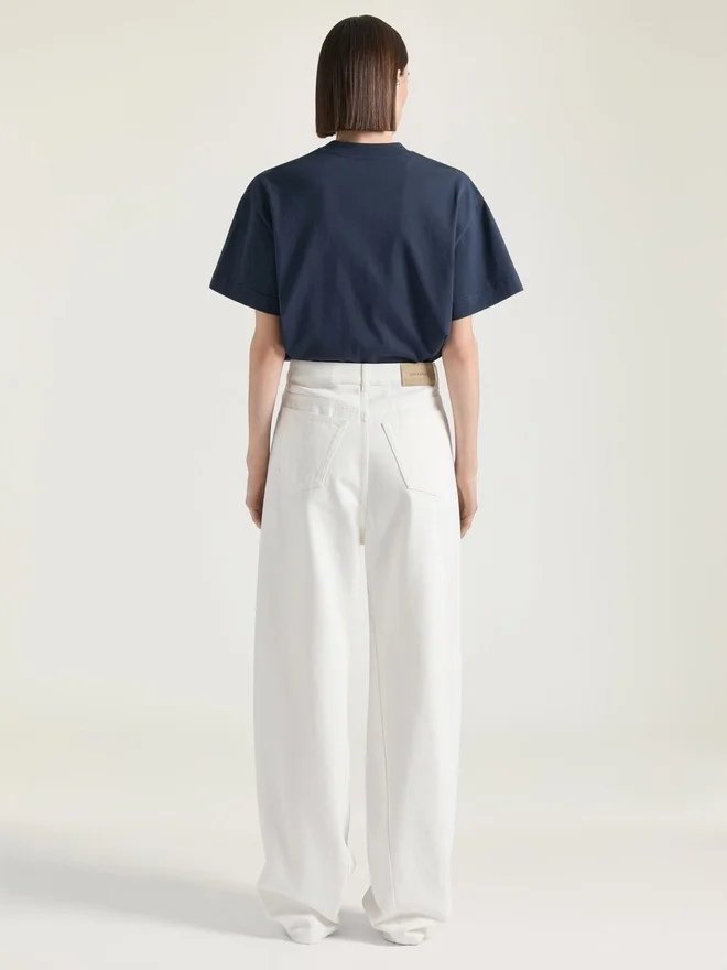 Volume is Exaggerated, Patterns Reworked and Seams Inverted to Shape the Cocoon Silhouette. Pants in White Denim. Waist with