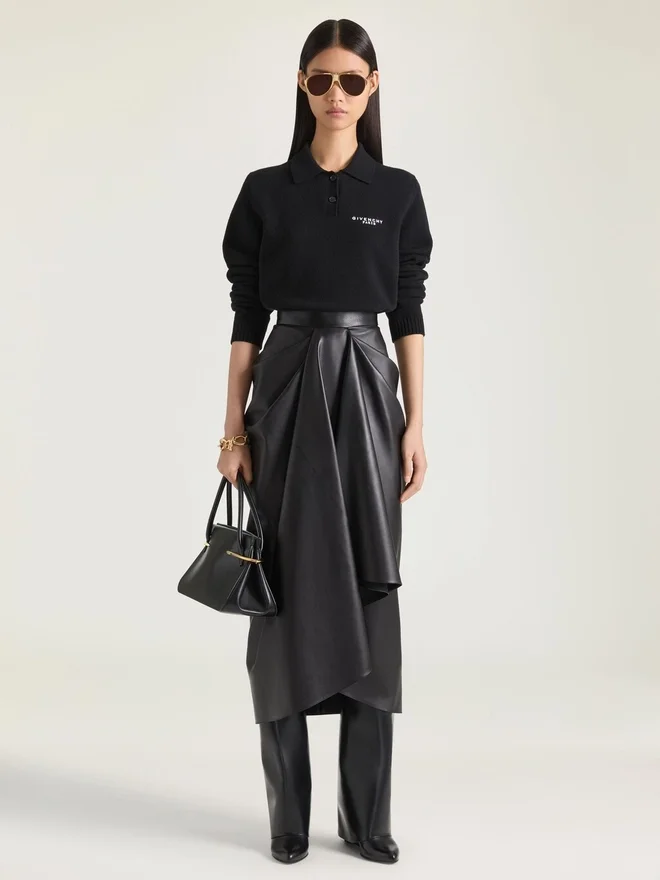 A Silhouette Inspired by the Gesture of Draping a Leather Jacket over a Mannequin. Fabrics Are Twisted and Wrapped Around the Body with Sensuality, While Front Slits and Pockets Create Movement and Attitude.