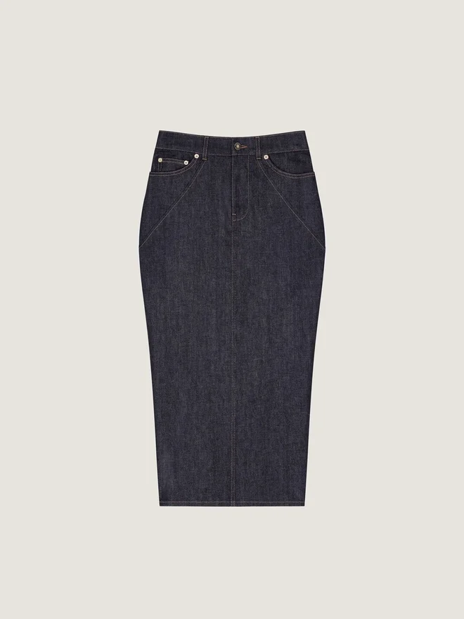 - Midi Skirt in Raw Denim with Contrasting Stitchings.