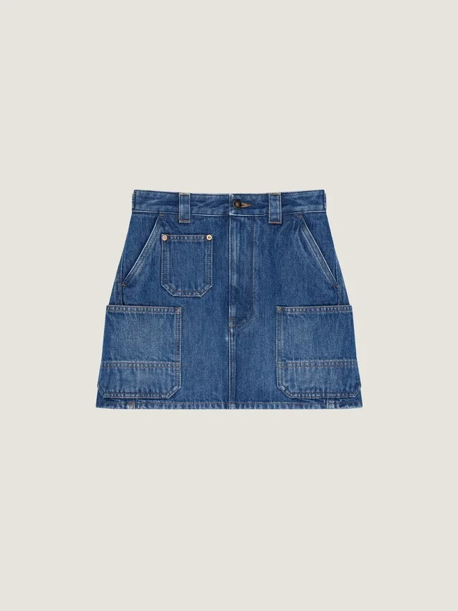 • Mini Cargo Skirt in Medium Blue Denim.