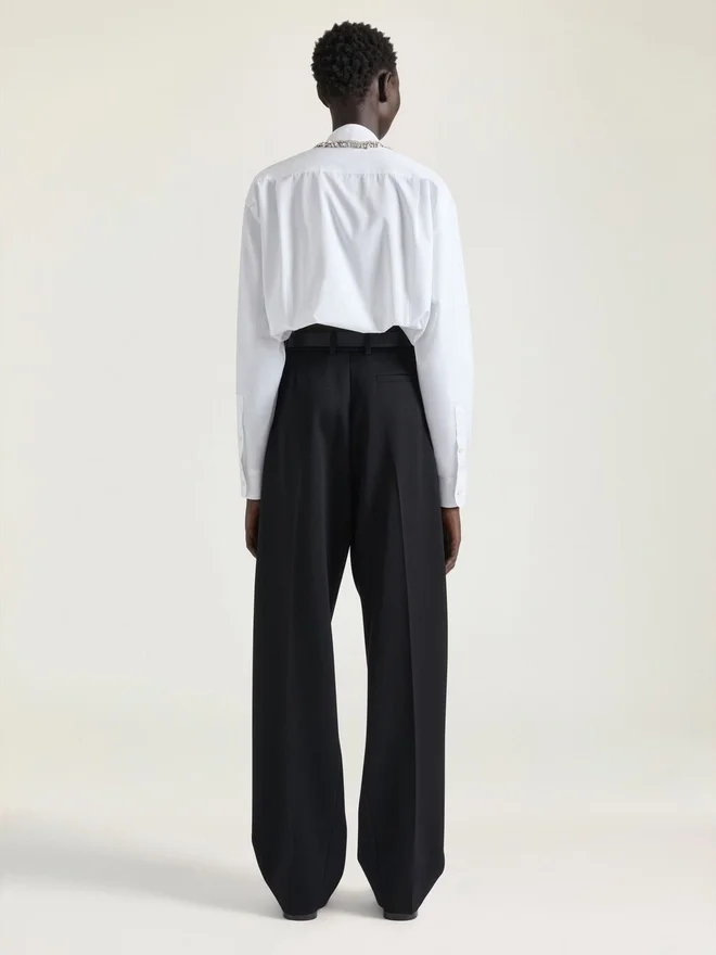 Long-Sleeved Shirt in Cotton Poplin. Mao Collar. Crystals Embroidered on Collar. Button Closure. Buttoned Cuffs. Elastic on the