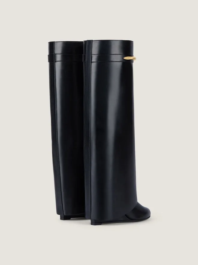 Boots in Calfskin Leather. Shark Pinch Line. Metal Pinch with Givenchy Engraved. Golden-Finish Metal Details. Pointy Toe. Covered