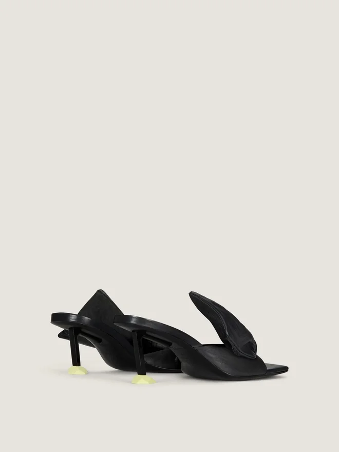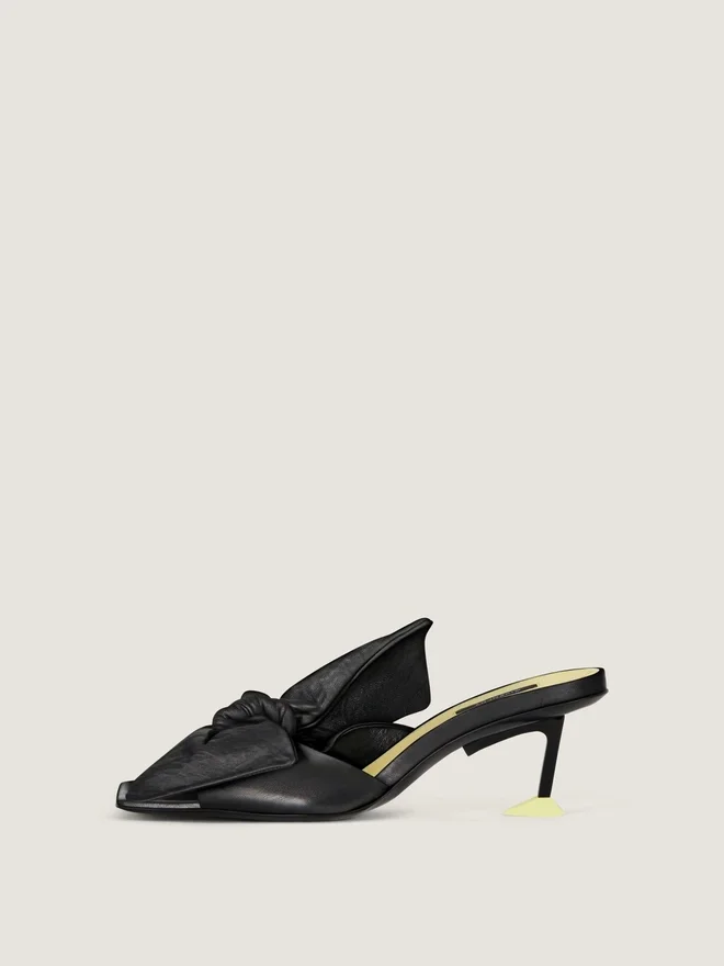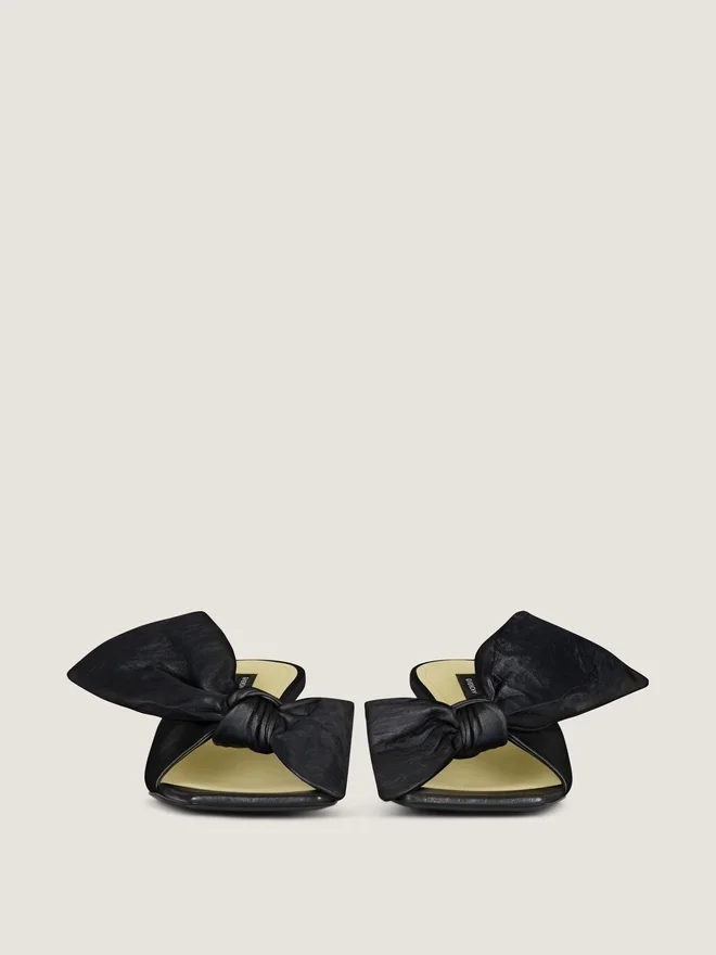 Heeled Mules in Nappa Sheep Leather. Boudoir Line. Large Memory-Shape Leather Bow That Retains Its Volume and Structure, Stitched