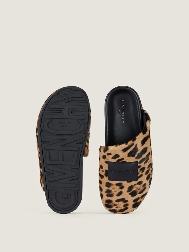 Flat Mules in Pony Effect Lambskin with Leopard Pattern. Label Line. Asymmetric Design. Debossed Givenchy Paris Label on the Top.
